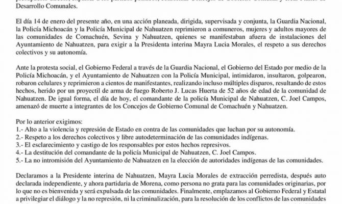 Comunicado: Consejo Supremo Indígena de Michoacán denuncia represión y amenazas de muerte en contra de Concejos Comunales de Comachuén, Sevina y Nahuatzen. Comunidades P`urhépecha a 15 de enero del 2020.