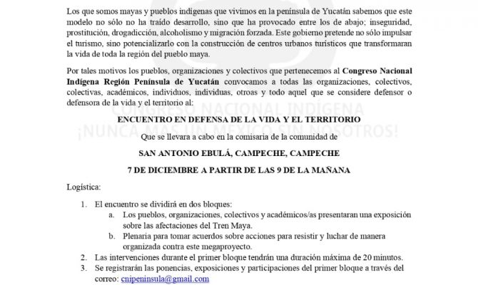 Convocatoria Encuentro en defensa de la vida y el territorio Considerando que quienes gobiernan; intentan imponer sus megaproyectos desde la manipulación de información y de las formas, que es claro que pretenden…
