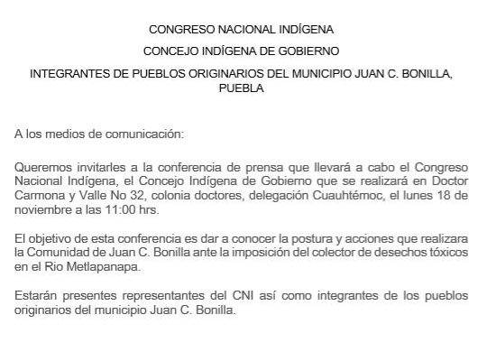 CONGRESO NACIONAL INDÍGENA CONCEJO INDÍGENA DE GOBIERNO INTEGRANTñES DE PUEBLOS ORIGINARIOS DEL MUNICIPIO JUAN C. BONILLA, PUEBLA A los medios de comunicación: Queremos invitarles a la conferencia de prensa que llevará a…