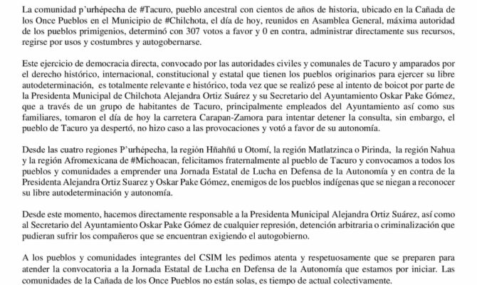 PESE A INTENTO DE BOICOT, TACURO DECIDE A FAVOR DEL AUTOGOBIERNO TACURO ANTAKUA ¡VICTORIA PARA TACURO! AL AYUNTAMIENTO DE CHILCHOTA A LOS PUEBLOS Y COMUNIDADES ORIGINARIAS AL PUEBLO DE MÉXICO Y DE…