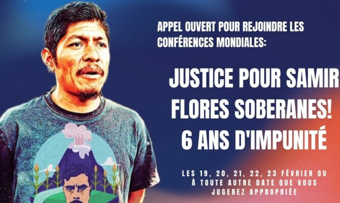 APPEL OUVERT POUR REJOINDRE LES CONFÉRENCES MONDIALES : JUSTICE POUR SAMIR FLORES SOBERANES! 6 ANS D’IMPUNITÉ Les 19, 20, 21, 22, 23 février ou à toute autre date que vous jugerez appropriée.