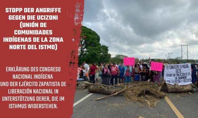 Stopp der Angriffe gegen die UCIZONI (Unión de Comunidades Indígenas de la Zona Norte del Istmo) Erklärung des Congreso Nacional Indígena und der Ejército Zapatista de Liberación Nacional in Unterstützung derer, die im Isthmus widerstehen.