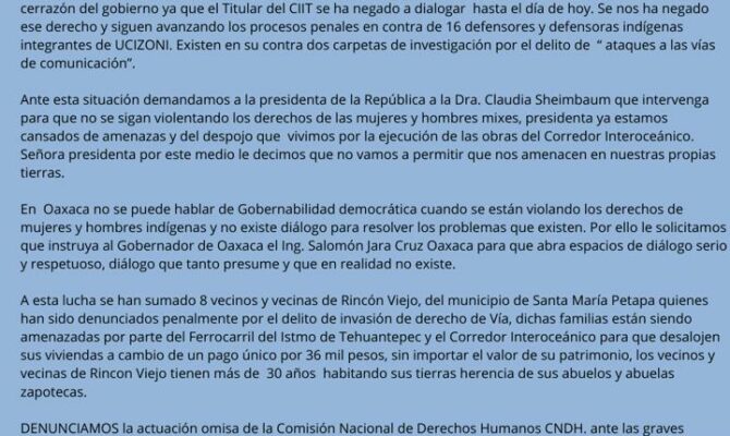 COMUNICADO DE PRENSA UCIZONI. 22/01/2025 DENUNCIAMOS LA CRIMINALIZACIÓN HACIA 24 DEFENSORES Y DEFENSORAS INDIGENAS EN EL ISTMO DE TEHUANTEPEC