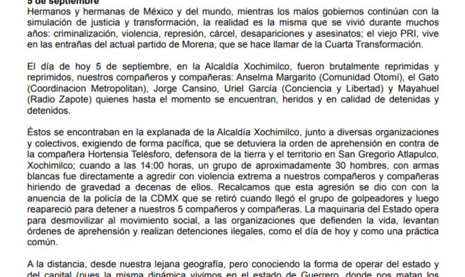 Hoy, 5 de septiembre, durante una movilización en defensa de los pueblos originarios y contra la criminalización en Xochimilco, la Fiscalía y cuerpos represivos realizaron detenciones y desapariciones forzadas en un contexto…