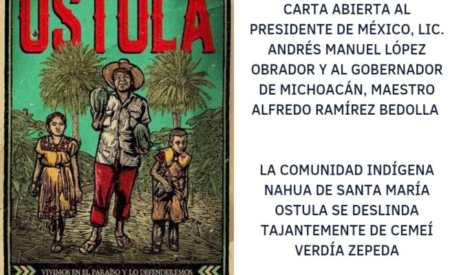 CARTA ABIERTA AL PRESIDENTE DE MÉXICO, LIC. ANDRÉS MANUEL LÓPEZ OBRADOR Y AL GOBERNADOR DE MICHOACÁN, MAESTRO ALFREDO RAMÍREZ BEDOLLA. LA COMUNIDAD INDÍGENA NAHUA DE SANTA MARÍA OSTULA SE DESLINDA TAJANTEMENTE DE CEMEÍ VERDÍA ZEPEDA