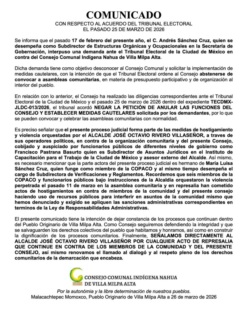 Ciudad de México, 4 de septiembre de 2024 -Proceso judicial irregular podría despojar a la comunidad indígena nahua de 2 mil 760 hectáreas de su territorio y cederlas a privados – La…