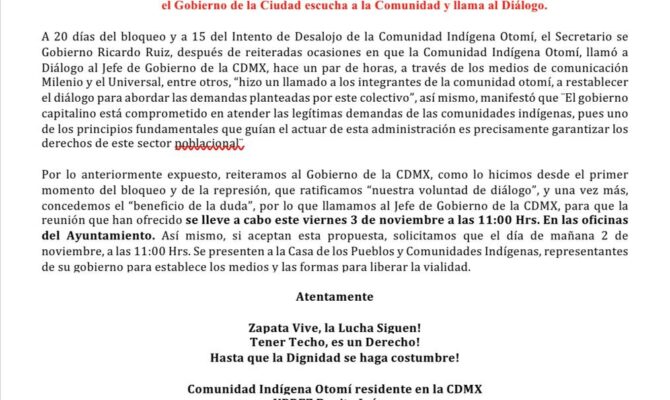 COMUNIDAD OTOMÍ RESIDENTE EN LA CDMX RATIFICA VOLUNTAD DE DIÁLOGO CON EL GOBIERNO DE E LA CDMX